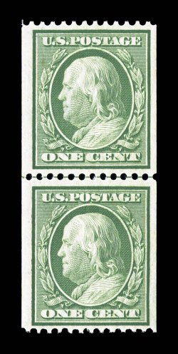 n.h., extremely fine a very scarce line pair in this exceptional qual#348, 1c Green coil, perf. 12 horiz., highly select mint guide line pair, excellent centering amid large margins, outstanding prooflike color and impression, unblemished o.g., n.h., extremely fine; a very scarce line pair in this exceptional quality; 2001 PF certificate and a 2008 PSE certificate (XF-Superb 95; SMQ $1,900.00). (Image) $600.00