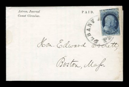 Astronomical Journal printed circular by famous astronomer Dr. C#8A, 1c Blue, Ty. IIIa, position 54R4, very large margins on three sides, just in at fourth margin at right, tied by "Albany, N.Y., Paid" circular handstamp on fresh July 29, 1857 Astronomical Journal printed circular by famous astronomer Dr. C.H. Peter, stamp with very minor facial abrasion at upper right and trivial minute gum stain, otherwise very fine; 2004 A.P.S. certificate; Scott catalog $1,300.00 for #8A on a "normal" cover. (Image) Est. $300-400