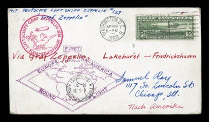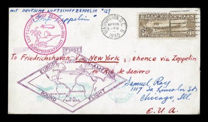 Antonio, proper cachets and markings, card with a few minor toned spots#C14, $1.30 Graf Zeppelin, nicely centered right margin plate no. 20085 single tied to flown first day card by "Washington, D.C./Apr 19/1930" machine cancel, addressed to San Antonio, proper cachets and markings, card with a few minor toned spots, fine. (Image) $1,000.00
