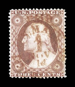 certificate.#30, 5c Orange brown, Ty. II, uncharacteristically well centered and margined, deeply rich color, complete strike of a grid in circle cancel, very fine; 1974 PF certificate. (Image) $1,200.00