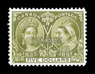 never hinged copies of any of the dollar value Jubilees are terribly diff#61, 1897 $1.00 Jubilee, a wonderfully fresh mint example, featuring deep rich color and a well incised impression, attractively centered, full clean o.g., n.h., very fine; never hinged copies of any of the dollar value Jubilees are terribly difficult to find (Unitrade C$3,600.00). (Image) $2,400.00