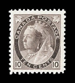 white paper, in addition it is marvelously well centered within uncommo#73, 1897 10c Brown violet "Maple Leaf", a most impressive mint example of this key high value, possessing strikingly deep rich color and a prooflike impression on immaculate white paper, in addition it is marvelously well centered within uncommonly wide margins, o.g., n.h., extremely fine; actually a rare stamp in this premium quality; ex-Dr. Tang (Unitrade C$2,250.00). (Image) $1,250.00