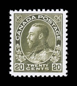 extremely fine and uncommonly choice (Unitrade C$450.00).#119, 1925 20c Olive green "Admiral", dry printing retouch in spandrel variety, beautifully centered within large margins, especially strong color and impression, o.g., n.h., extremely fine and uncommonly choice (Unitrade C$450.00). (Image) $275.00