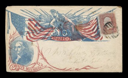 right margin, otherwise exceedingly fresh and very fine.Martha Washington portrait in red, white and blue all-over frame (Walcott #102), 3c Rose (#65) cancelled by target and c.d.s. at left, cover with tiny nick in the top of the right margin, otherwise exceedingly fresh and very fine. (Image) Est. $300-400