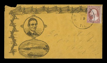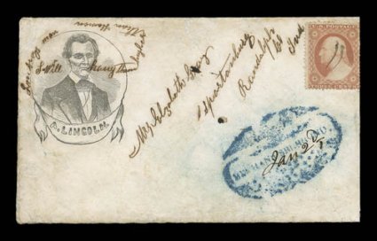 Mechanicsburg, Ind. at bottom right, with ms. date, small ms. note around Lincoln "John Grays man - I will hang them higher than Haman", cover slightly reduced at right affecting the adhesive and with small sealed tears at left, fine appearance. (Image) |