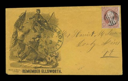 "Remember Ellsworth" imprint above design of three soldiers murdering with a bayonet (Walcott #433), black design on orange cover, 3c Dull red (#26) cancelled by black