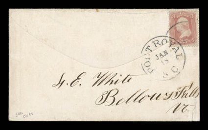 Fortress Monroe, Va. all over design in blue (Walcott #766), 3c Rose (#65) tied on reverse by "Port Royal, S.C., Jan 18" c.d.s., sent to Vermont, cover with small