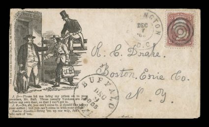"Seeing the Elephant" black imprint and design, with "Let Me Alone" at top (Walcott #1038), 3c Rose (#65) tied by grid and with "Wilkes Barre, Pa/Dec 24" matching c.d.s.