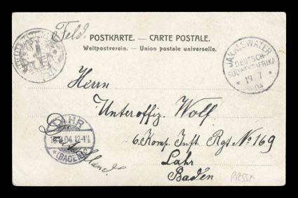 a 25pf value, one cover with a complete set of the 1899 Overprints, sevGerman South West Africa interesting cover lot of 37 items, most are better covers that were purchased on an individual basis at auction or retail, some forerunners including a 25pf value, one cover with a complete set of the 1899 Overprints, several better and desirable cancels including some scarce manuscript postmarks tying the stamps, a few Feldpost negative pmks., and much more; an excellent lot of scarce and desirable covers. (imagea) (imageb) (imagec) (imaged) (imagee) (Image) Est. $2,000-3,000