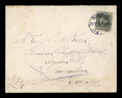 1780 c   1915-16 General Grant Auckland Islands Expedition, New Zealand 12p and 2p adhesives tied to elusive expedition cover by two strikes of Auckland Islands23 Mar 1916Catlings