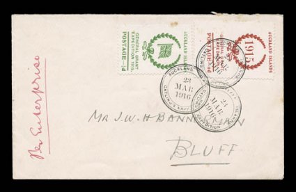 1916Catlings Expedition double circle postmarks, addressed to1915-16 "General Grant" Auckland Islands Expedition, 1/2p Green and 1p Red expedition "stamps", the set of two tied to a very rare cover by three strikes of "Auckland Islands/23 Mar 1916/Catling's Expedition" double circle postmarks, addressed to a MR. J.W.H. Bannerman in Bluff, red "per Enterprise" manuscript endorsement at left, just a couple of trivial toned specks to cover at top right (on a couple perforations on the 1/2p as well), very fine; this cover, and the next one that follows, are the only two we have recorded bearing these unique issues. (Image) Est. $1,000-1,500