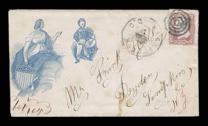 trivial stain at bottom, otherwise very fine a scarce design ex-WaFemale Figure with Dummer Boy in blue (Walcott #2184), 3c Rose (#65) tied by target, with Washington, D.C. c.d.s. alongside on cover to New York, cover opened at left and with trivial stain at bottom, otherwise very fine; a scarce design; ex-Walcott. (Image) Est. $300-400