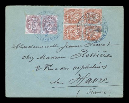 de FranceIles Kerguelen type I Resident Administrator cachets iKerguelen Island 1909 cover to Le Havre, franked with France horizontal pair of the 2c and a 3c block of four of the "Liberty" stamps, tied by two excellent strikes of "Residence de France/Iles Kerguelen" type I "Resident Administrator" cachets in blue, from the Bossiere Brothers correspondence, partial "Siene/23-5/09" bkst., light vertical file fold not affecting stamps, very fine; another incredibly rare and desirable early T.A.A.F. cover. (Image) Est. $750-1,000