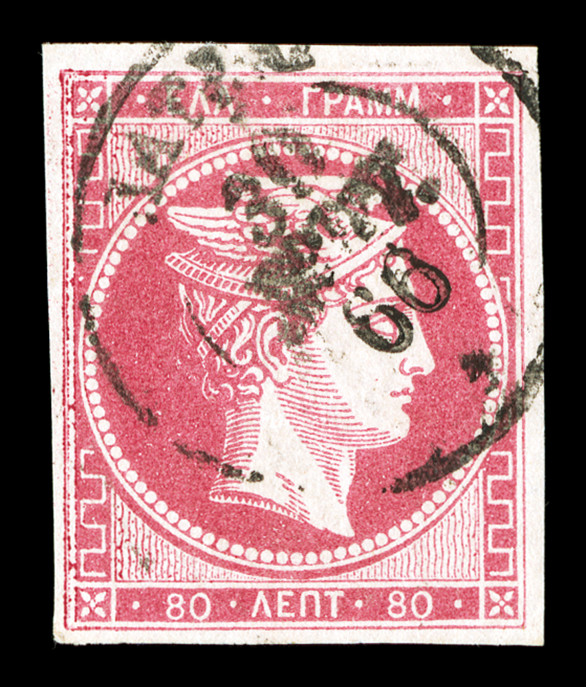 numeral 2 in grid of dots cancel, very fine (Michel 22 var.).#22b, 1862 80l Carmine on pale rose, "8" of "80" numeral on reverse Inverted, another used example, this one in a deeper shade, four full and balanced margins, intense color, neat numeral "2" in grid of dots cancel, very fine (Michel #22 var.). (imagea) (Image) $400.00