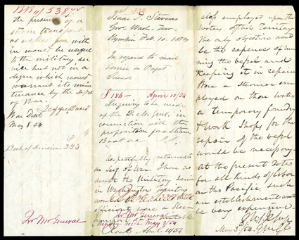 made in an LS by Stevens while governor of the Washington Territory,[Washington Territory, Jefferson Davis and Isaac Stevens] Choice pair of Notes Signed by Davis as Secretary of War, (signing as "Jeffer: Davis" and as "J.D."), denying a request made in an LS by Stevens while governor of the Washington Territory, February 10, 1854. Stevens writes:"...urging the importance to this territory of a direct mail communication with San Francisco and also soliciting the establishment of some weekly mail communication by steam vessels between Olympia, at the head of Budd's Inlet, the Seat of Government...and Whatcom on Bellingham Bay, touching at the various settlements on Puget Sound & Admiralty Inlet...I beg to call your attention to the bearing which such a service would have on the defenses of the Territory, as well as upon its business relations." Davis agrees that the service would be useful, but does not deem it of sufficient importance for the War Department to foot the bill; separated fold, and fold wear; the additional Davis note refers the matter to the quartermaster's department, and receives the response of General Jesup. (imagea) (Image) Est. $500-750