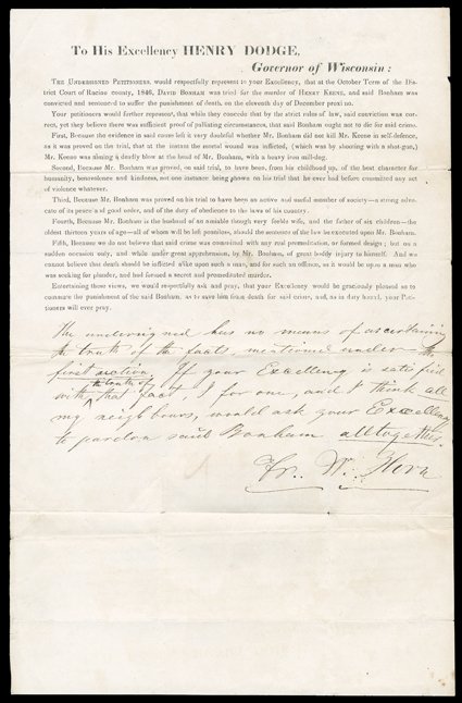 Bonham in May 1846. Bonham was convicted and sentenced to be executed[Racine, Wisconsin, Bonham Murder], four important legal history items concerning the murder of Henry Keene, the first in the newly formed Waukesha County, Wisconsin, by David Bonham in May 1846. Bonham was convicted and sentenced to be executed; the present material concerns appeals for a remittance of his sentence. Includes a printed Petition to Wisconsin Governor Henry Dodge, signed by F.W. Horn, a local justice of the peace. He represents to the governor that Bonham should not be hanged,"Because the evidence...left it very doubtful whether Mr. Bonham did not kill Mr. Keene in self-defense, as it was proved...that at the instant the mortal wound was inflicted...Mr. Kenne was aiming a deadly blow at the head of Mr. Bonham, with a heavy iron mill-dog (an iron bar used in lumber milling; Bonham and Keene disputed ownership of a sawmill) ...Mr. Bonham was proved...to have been .. otherwise fine the best character for humanity.. to have been an active and useful member of society - a strong advocate of its peace and good order." He is also a family man, and Horn does not believe the crime was premeditated. He adds his own note at the close suggesting that Bonham should be pardoned entirely.With an autograph postscript by David Bonham (rest of letter not present) on the verso of the address panel of a letter to Byron Kilbourn of Milwaukee, January 14, 1847. He pleads, "Could I but get a pardon I would leave the territory forthwith Should the governor request it...I think my friends would bail me, for my God knows that could I once get out of this, they never would Catch Dave Bonham in another Scrape...God knows that the thought of fireing the gun never entered my head nor heart, more than 1/4 of a minute before it was done and not till he was within a 2d...of strikeing me with that deadly weapon." With his letter of January 27, to John J. Haight, probably a state legislator, in Madison, lamenting, "I learn that His Excellency has rejected my application for a commutation of my Sentence. This of course seals my fate...Altho I know I must meet my God next Wednesday (February 3) ...O dear friend I beg and pray of you to aid if possible in amending the act relative to Capital punishment, so as to Save me from death," adding in a postscript, "In the name of humanity pass an act haveing in its object the 1st 2d and 3d degree of murder and define the first degree, so that no man Shall die for Such an act done in an offway...innocent of an intent to Kill...even if it cant help me any."With a choice letter by a woman named Harriet of Racine, February 28, 1847, to her nephew in Moravia, NY. She explains that Bonham has already received two reprieves of his execution, but "is to be hung on wednesday of this week" (March 3). He was to be hanged on February 3, and "every necessary preparation was made for his execution and burial, even to the coffin, and grave clothes. Many people came in from the country...A company of soldiers ..Soon after a man came...with another respit of thirty days...Five hundred had come to town...some of them were so mad...that they threatened to burn the court house and jail, if Bonham was not brought out and hung...So they stuffed old clothes, with straw...swung it on a pole, and then set fire to it. Another respit will not be granted"The day after this letter, Governor Dodge commuted Bonham's sentence. He was eventually released from prison, moved to Missouri, and lived another 23 years. It is still unclear whether he acted in self-defense or killed Keene deliberately because he had begun to dismantle the mill whose ownership was in question. Wisconsin now distinguishes clearly between homicide in self-defense, a privileged act that might not warrant prosecution, and first or second degree intentional homicide. (imagea) (Image) Est. $1,000-1,500