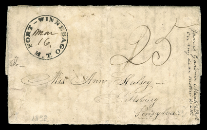 leaf to Brigadier General Brady at Detroit, fresh and extremely finFort Winnebago - M.T., bold straightline postmark as Michigan Territory, present day Wisconsin, and manuscript "20 July" and "25" rate on 1831 folded letter with integral address leaf to Brigadier General Brady at Detroit, fresh and extremely fine; the earliest recorded postmark in addition to being the only known example of this straightline handstamp; ex-Jarrett.The letter is written by Captain Joseph C. Plymouth, 5th Infantry, commanding. It is a "Detailed report of the encroachment of the wites upon Indian lands in the vicinity of the Fort." Most of the "whites" were contractors, trappers and traders.Fort Winnebago was constructed by troops under the command of Major David E. Twiggs during the years 1828-31. It was located in the Winnebago country, at the portage between the Wisconsin and Fox rivers, about half way between Fort Howard on Green Bay and Fort Crawford at the confluence of the Wisconsin and Mississippi rivers, in what was then the Michigan Territory. As a military post it played an important part in the Black Hawk War. In 1845 the post was closed and the troops were withdrawn for service in the Mexican War. (Image) Est. $750-1,000