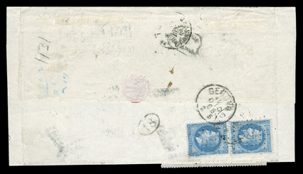 1970 postmark alongside on folded letter to New York, red Lond[British Post Office in Alexandria, Egypt] Great Britain 1865 4p Vermilion (#43, plate 11) and 1869 6p Red violet (#45, plate 8) tied by "B01" postmarks with matching "Alexandria/Jy 19/70" postmark alongside on folded letter to New York, red London transit and New York Paid All handstamps, as well as "2/Cents" in arc, ms. "French Packet via Marseilles", an exceptionally fresh and very fine cover. (Image) Est. $300-400