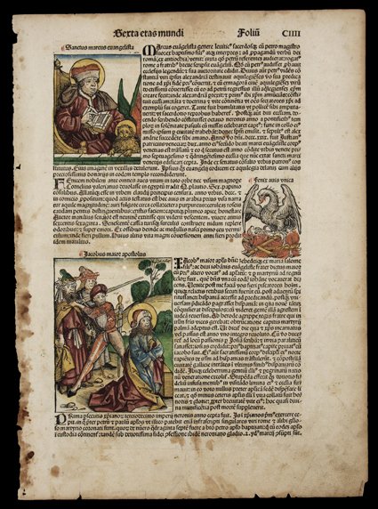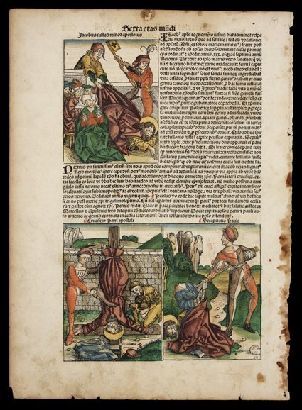1239   Incunabula Leaf, Serta ertas mundi, Folio CIIII, depicting the martyrdom of apostles James the Elder, James the Younger, Peter, and Paul. Also shows St. Mark and a phoenix rising from flames. 17.5" x 12.6". Latin text in gothic. We have not identified the printer of this choice leaf, but would date it ca 1475-1500. Heavily foxed at one edge, with usual edge wear and soiling, but a magnificent item with beautiful hand-tinting. (imagea) (imageb) Est. $1,500-2,000