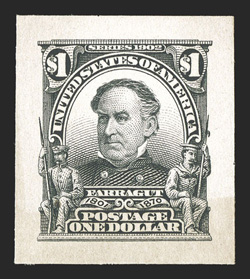 neckpiece all unfinished, horizontal background lines only and frame#313-E1, $5.00 Dark green, incomplete die essay on India paper die sunk on 94x105mm card, showing significantly incomplete engraving, with top ovals blank, eye, cheeks, hair and neckpiece all unfinished, horizontal background lines only and frame engraved in outline only, fresh and very fine; the unique progressive die essay for the Five Dollar 1902 issue, there are no other known progressive die impressions for this high value; a highly important item the the 1902-03 or Bureau issue specialist; ex-"Cheshire" collection. (Image) $8,000.00