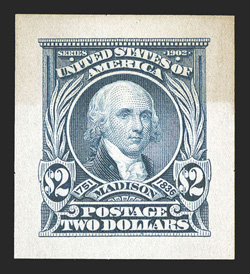 fine only 85 were produced.#313P2, $5.00 Dark green, small die proof mounted on small piece of original gray card backing from the Roosevelt album prepared in 1903, brilliantly fresh and clean, extremely fine; only 85 were produced. (Image) $375.00