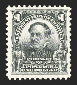 357 S 313S 313S, $5.00 Dark green, with Specimen. type E handstamped vertically in the left margin, exceptionally fresh, intense color, o.g., l.h., fine and scarce.#313S, $5.00 Dark green, with "Specimen." type E handstamped vertically in the left margin, exceptionally fresh, intense color, o.g., l.h., fine and scarce. (Image) $500.00