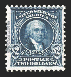 pair, this being the left stamp.#293, $2.00 Trans-Mississippi, bottom margin imprint single, uncommonly large margins for this high value, rich color, o.g., lightly hinged, very fine; 2007 PF certificate for a pair, this being the left stamp. (Image) $1,900.00