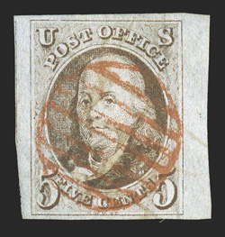 certificate.#1, 5c Red brown, three large margins, close at top, bright color and a fine impression, cancelled by a scarce bright red Paid 5 postmark, nearly very fine; 2009 PSE certificate. (Image) $600.00