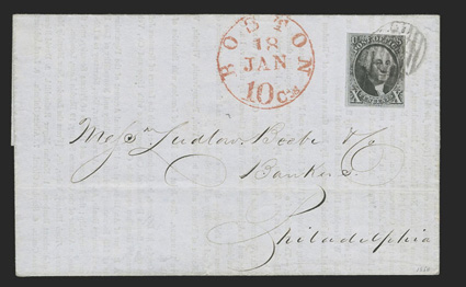 1849-50 to Philadelphia, red Boston 10cts Jan. 18 c.d.s., ligh#2, 10c Black, ample to large margins around except just touching the frame line at top right, crisp impression, tied by black grid on folded printed "The Banker's Magazine for 1849-50" to Philadelphia, red "Boston 10cts Jan. 18" c.d.s., light horizontal file fold not affecting stamp or markings, nearly very fine. (Image) $1,950.00