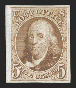 fine.#3, 5c Red brown reproduction, without gum as issued, select example, four large to huge margins, vivid rich color and a razor-sharp impression on fresh paper, extremely fine. (Image) $750.00
