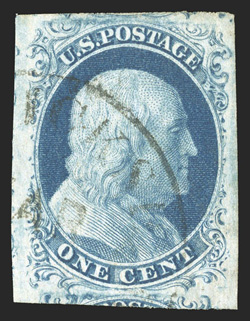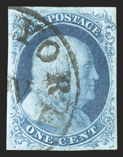 design shows, distinctive powder blue color typical of the plate one e#5A, 1c Blue, Ty. Ib, position 5R1E, handsome used example of this very rare stamp, featuring large to huge margins on three sides, fourth margin at right close but the full design shows, distinctive "powder blue" color typical of the plate one early printings, excellent impression on bright white paper, neat portion of large town c.d.s., very fine; 1988 PF certificate. (Image) $10,000.00