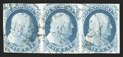 and perfectly balanced margins all around, deep luxuriant color#7, 1c Blue, Ty. II, a magnificent horizontal strip of three, positions 56-58R2, with the right stamp showing both a double transfer and a small plate crack at top right, lavish and perfectly balanced margins all around, deep luxuriant color and a wonderfully detailed impression, very light and unobtrusive town cancels, accompanying certificate mentions "tiny creases at top" which appear nothing more than trivial natural usage bends, still extremely fine; a marvelous showpiece for the One Cent Blue specialist; 1969 (clear) and 2002 PF certificates. (Image) $575.00+