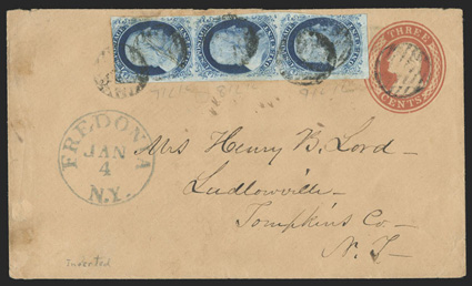 oval grid on cover to Marlboro, Mass., 11 also tied by a bold#11, 3c Dull red, four ample to large margins, tied along with #136L9, Swarts City Despatch Post, New York, N.Y., (1c) Red, with large even margins all around and fresh color, by oval grid on cover to Marlboro, Mass., #11 also tied by a bold "New-York/Feb 11" datestamp, very fine and scarce conjunctive usage. (Image) $450.00