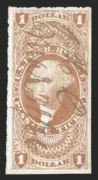 703 O R74a R74a, $1.00 Passage Ticket, imperforate, large to very large margins all around, bright and fresh, light 1866 ms. cancel, extremely fine.#R74a, $1.00 Passage Ticket, imperforate, large to very large margins all around, bright and fresh, light 1866 ms. cancel, extremely fine. (Image) $300.00