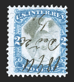 cancelled by a light oval blue handstamp dated Mar 30, 1872, as well as#R111a, 20c Blue and black, Center Inverted, an attractive example of this rare invert, possessing outstanding colors that are remarkably deep and rich, in addition it is cancelled by a light oval blue handstamp dated Mar 30, 1872, as well as an unusually light herringbone cancel that barely breaks the paper in one place, better centered than most, tiny trace of a thin speck at top right, still fine; only seventeen examples of the Twenty Cent with Inverted Centers are recorded, with this being one of the finest among that small group, as its centering is far superior to most (there are no very fine centered copies) and it is one of only six that possess the desirable handstamp cancel, plus we are aware of only one that does not have faults. (Image) for fine $12,500.00