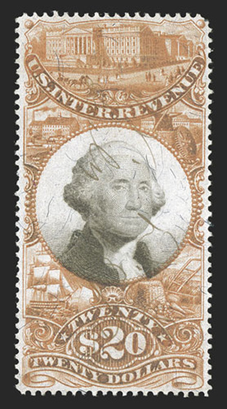 720 O R150 R150, $20.00 Orange and black, incredibly well centered for this, very light ms. cancel, nibbed top right corner perf., otherwise extremely fine.#R150, $20.00 Orange and black, incredibly well centered for this, very light ms. cancel, nibbed top right corner perf., otherwise extremely fine. (Image) $625.00