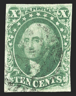 extremely fine.#15, 10c Green, Ty. III, an outstanding left sheet-margin single, other margins also exceptionally large, rich color and a crisp impression, light and unobtrusive cancels, extremely fine. (Image) $200.00
