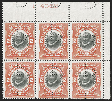 1147 ogbl 39 var. 39 var., 2c Vermilion and black, with P perfin, top right corner margin block of six, with inverted P on all stamps and in the top margin as well, vibrant colors, o.g.,