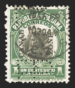 reportedly the only example of the double P perfin variety ever recor#55 var., 1c Light green and black, with perforated "P' double, with both "P"s reversed, well centered, fairly light cancel, small crease at top right, otherwise very fine; reportedly the only example of the double "P" perfin variety ever recorded on this value (CZSG #55.PPa). (Image) Est. $300-400