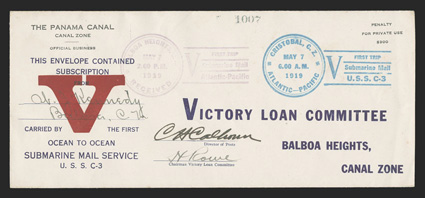 Mail cover with Victory Loan Committee pre-printed address, the lot alsLoan Committee covers, two legal size covers, one is on Oct. 18, 1918 First Flight cover with Liberty Loan Committee pre-printed address, other is May 7, 1919 First Submarine Mail cover with Victory Loan Committee pre-printed address, the lot also contains a couple WWII loan drive items, fine-very fine. (Image) Est. $150-200