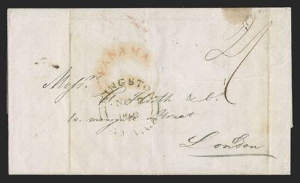 split circle Kingston, JamaicaNo 2, 1842 transit datestamp andPanama to London, folded letter datelined 21 September, 1842 with red British Post Office "Panama" double arc undated circular postmark and manuscript "2/-" double rate to London, split circle "Kingston, Jamaica/No 2, 1842" transit datestamp and red London 5 December backstamp, very fine; fewer than five examples of this "Panama" postmark are recorded in red; ex-DeVoss. (Image) Est. $750-1,000