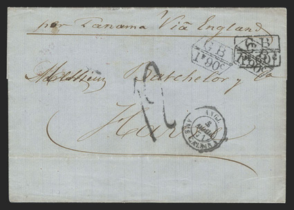 unpaid letter from Central America or the West Indies that has beenCallao, Peru to Paris, folded cover with British Post Office "Callao/Ja 12, 1858" origin backstamp and incorrectly struck rectangular "G.B./1F60c" accountancy mark signifying an unpaid letter from Central America or the West Indies that has been overstruck with "50" in barred oval of the Chief Letter Carrier's Office in London that was used to cancel incorrect marks, correct hexagonal "GB/2F89 5/10c" handstamp applied alongside, red London 17 February, 1858 transit backstamp, Calais entry datestamp and "24" decimes due for double weight letter, Paris arrival backstamp, fresh and very fine. (Image) Est. $200-300