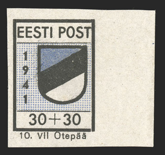 1355 nh Michel 2 A II F Otepaa Michel 2 A II F, 1941 30+30K Black and blue, Ty. II, blue omitted, bottom right corner margin mint single, o.g., n.h., two light blue lines at lower left, otherwise