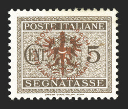 the Ty. III overprint only occurs in four positions in the overprZara Michel #1-3, 5-8, 1943 5c-20c and 30c-60c "Deutsche/Besetzung/Zara" Ty. III overprints on postage dues, all but 60c sheet-margin singles, o.g., n.h., fresh and fine-very fine; the Ty. III overprint only occurs in four positions in the overprint setting of 100; each signed Raybaudi and accompanied by his 1994 certificate for 5c-50c and 1991 certificate for 60c. (Image) Michel €3,696