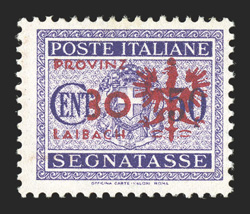 certificate.Laibach Michel #19 DK, 1944 50L on 1.75L Red orange, double surcharge, one inverted, well centered, o.g., l.h., very fine; only 100 stamps were discovered; 1986 Krischke certificate. (Image) Michel €1,100