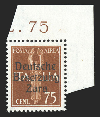 n.h., very fine the Ty. III overprint only occurs on four positionZara Michel #23-27, 1943 25c-1L "Deutsche/Besetzung/Zara" Ty. III overprints on air post stamps, fresh and well centered, 75c and 80c top right corner sheet-margin singles, o.g., n.h., very fine; the Ty. III overprint only occurs on four positions in the overprint setting of 100; each signed Ryabaudi and 80c accompanied by his 1992 certificate. (Image) Michel €1,971