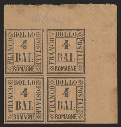 with slight gum toning as usual), large margins, 5b with trivial thin i#1-9, 1859 ½b-20b Definitives cplt. in a beautifully matched set of top right corner sheet-margin blocks of four, strong fresh paper colors, all with full original gum (a few with slight gum toning as usual), large margins, 5b with trivial thin in the selvage only, extremely fine; a rare and handsome set of corner margin blocks; 1992 E. Diena certificate for the set (Sassone #1-9; €11,000). (imagea) (Image) $8,170.00