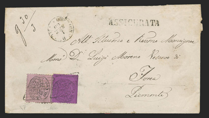 handstamp, several backstamps, backflap with tears, fine a rare frankin#23, 25, 1868 20c Black on deep crimson, 80c Black on rose lilac, single of each tied by diamond grid cancels on 1869 cover to Ivrea, Rome c.d.s., "ASSICURATA" straight line handstamp, several backstamps, backflap with tears, fine; a rare franking, especially with the 80c value; 1988 E. Diena and Bolaffi certificates (Sassone #28, 30). (Image) Est. $400-500