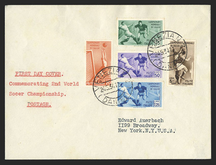 Venezia N2Danieli24.5.34 first day of issue postmarks to the same#324-328, C62-65, 1934 20c-10L+5L 2nd World soccer championship, complete sets of regular and air mail issues on separate covers, the stamps tied to each by two strikes of "Venezia N2/Danieli/24.5.34" first day of issue postmarks to the same recipient in New York, air mail set cover with a small tear at bottom, otherwise an extremely fine and rare matched set; cataloged as two sets on overfranked commemorative covers. (imagea) (Image) $5,200.00+