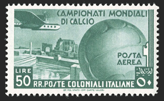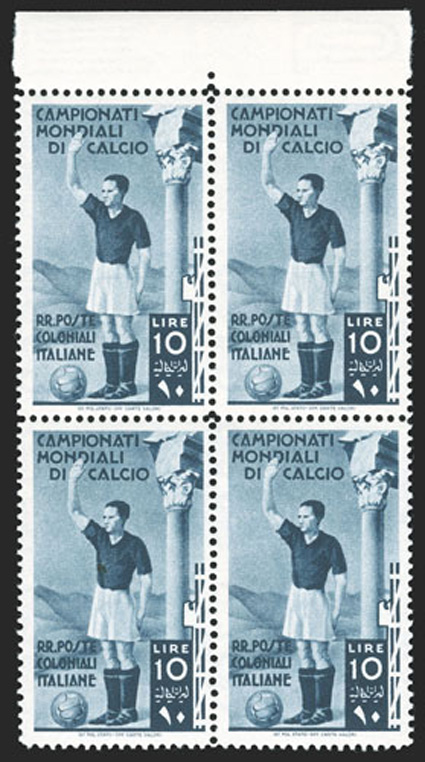 otherwise fine-very fine.#46-50, 1934 10c-10L 2nd World soccer championship cplt., fresh mint blocks of four, o.g., n.h., 10L with tiny adhesion spot on two stamps and a third with a natural inclusion, otherwise fine-very fine. (Image) $2,610.00